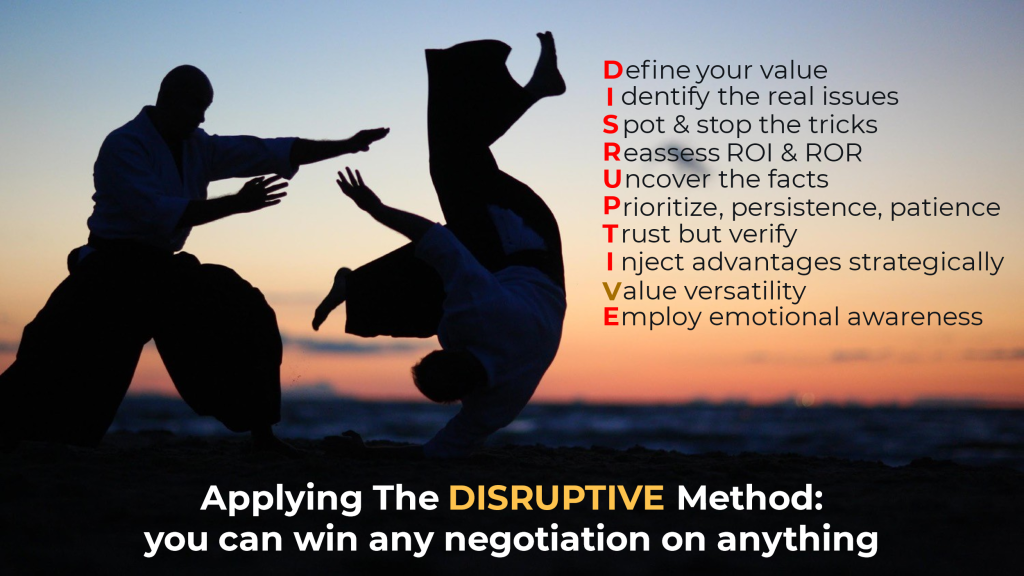 We call them the 10 Commandments of Negotiations Aikido. These are codified by the word DISRUPTIVE, giving rise to the DISRUPTIVE Method: